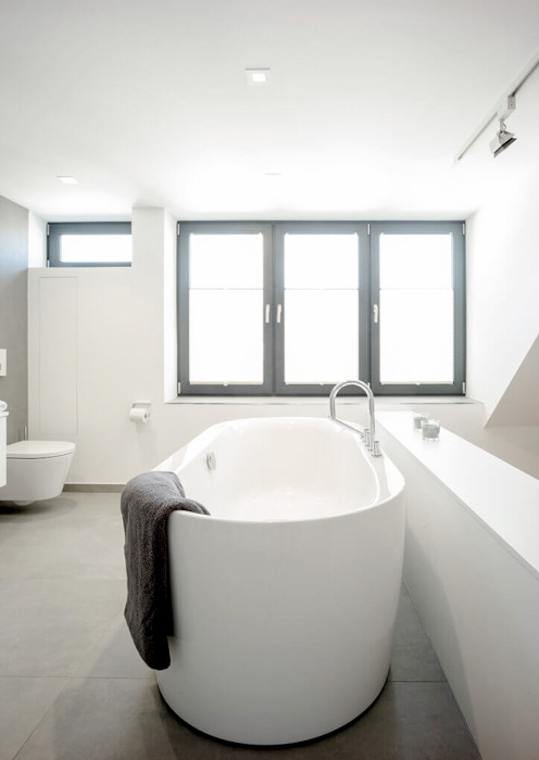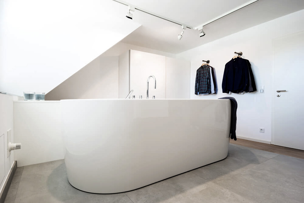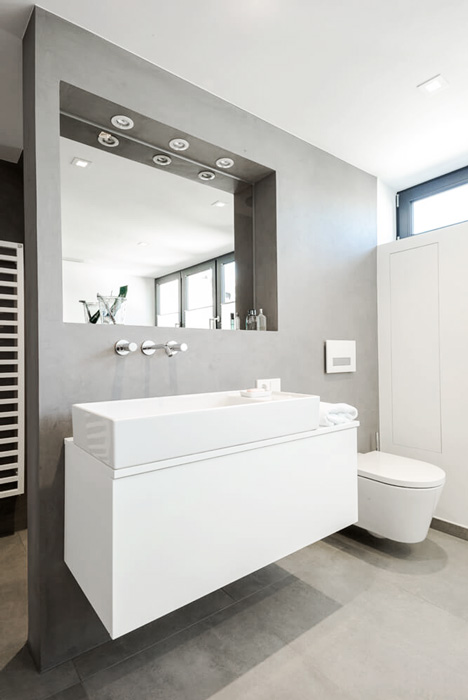 Neben dem weiß gekalktem Eichenparkett werden Badmöbel und Badewanne auf einem Podest mit Fliesenboden optisch vom Ankleidebereich getrennt. Die Wandflächen in Betonoptik sind auf den Bodenbelag abgestimmt. Die Fugenfreie Bearbeitung verhindert Schimmelbildung im Feuchtbereich und ermöglichen eine einfache und unkomplizierte Reinigung.