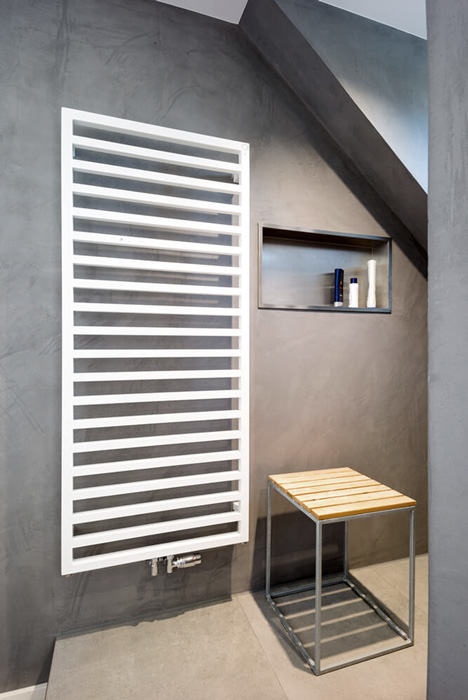 Auf dem praktischen Röhrenheizkörper lassen sich Handtücher aufhängen, die nach der Dusche schön warm sind.