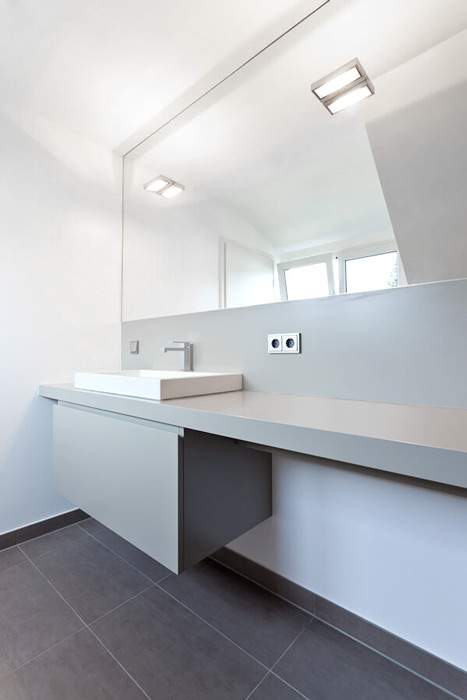 Dieses moderne Duschbad in Bonn Friesdorf besteht aus aufeinander abgestimmten Badkeramiken und Badmöbeln.