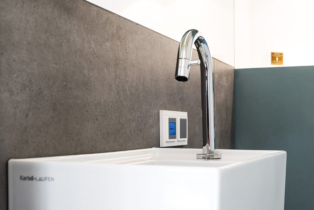 Auch auf kleinem Raum muss man auf schönes Design nicht verzichten. Ein platzsparendes Waschbecken von Laufen nimmt nicht zu viel Raum ein und eine Wandnische bietet genug Abstellplatz, ohne dass ein zusätzliches Regal benötigt wird.